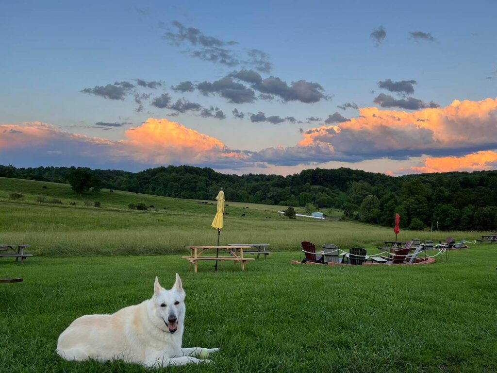 Solstice Farm Brewery in Catawba, Virginia, stretches across open farmland framed by direct Blue Ridge Mountain views. Guests can move freely across the property with dogs alongside them.