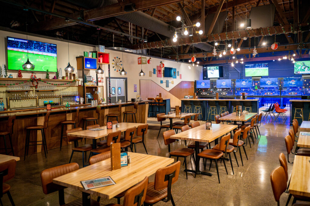 Guests can enjoy craft beer alongside duckpin bowling, arcade games, and social activities that make every visit feel like an event. The food and drink offerings are designed to complement the high-energy, interactive atmosphere.
